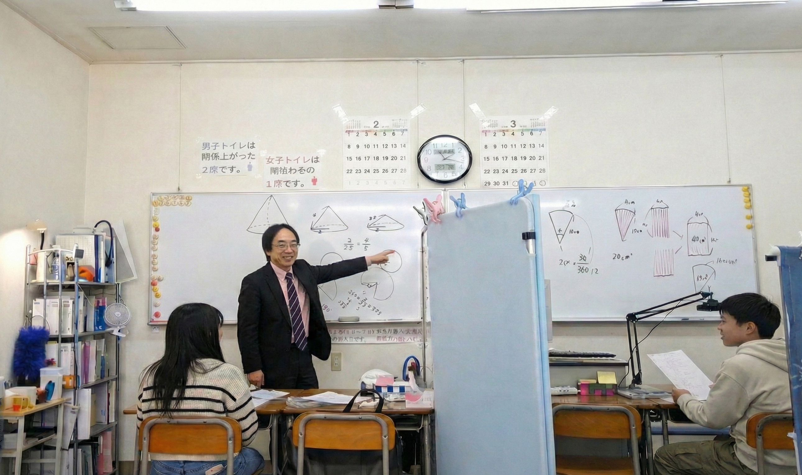 - 定員2名の個別指導です。ホワイトボードを使用したゆったりと空間で学習できます。