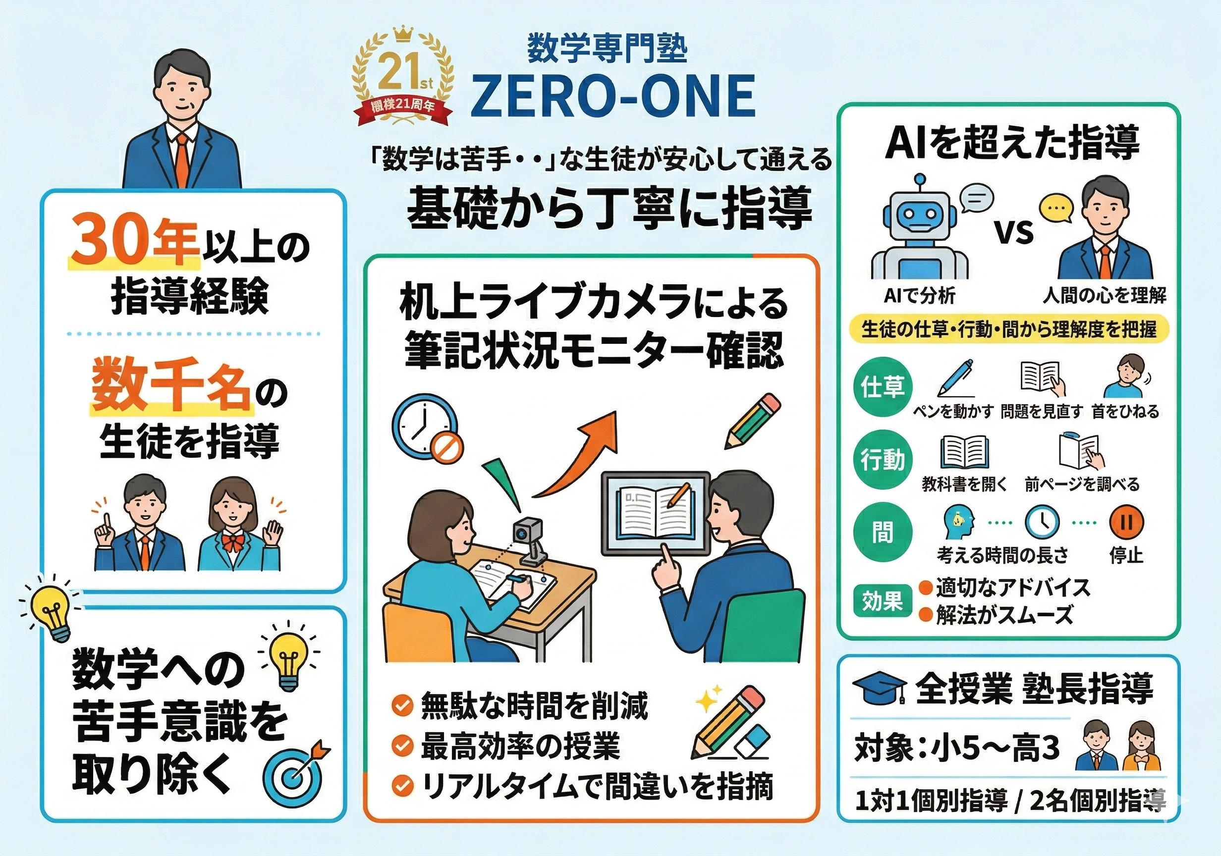 近年のAIを用いた瞬時の問題解法の提示・アドバイスが教育現場での支えであることは事実です。また、AIが生徒の顔色を判断できる時代に来ているとも思いますが、私の指導技術の中で決してAIでは出来ないことがあります。それは『生徒の仕草・行動・間』から『生徒のリアルタイムでの理解度』を感じて適切な指導をすることです。私には目の前にいる生徒が何も言わなくても、仕草・行動で『そのときの生徒の気持ち』が見えてきます。仕草『ペンを動かす・問題を見直す・首をひねる…等』、行動『教科書を開き始める・問題集の前のページを調べている…等』、間『解法の行動が止まる・考えている時間の長さが変わる』これらを肉眼で感じることができ、そして、生徒のその行動の種類・時間によって困っている状況の種類を判別して、そこですぐに経験からくる適切なアドバイスによって解法がスムーズに行えるようにします。これがゼロワンでの分かりやすさの最大の源です。そして、この『分かりやすさ』にプラスして上記の無駄な時間の削減を目的とした『机上ライブカメラ で筆記状況モニター確認』があれば、ゼロワンでこれから授業を始めてみようと考えている皆さんにとっては、最高の学習環境となり速やかな数学苦手解消のお役に立てると思っております。